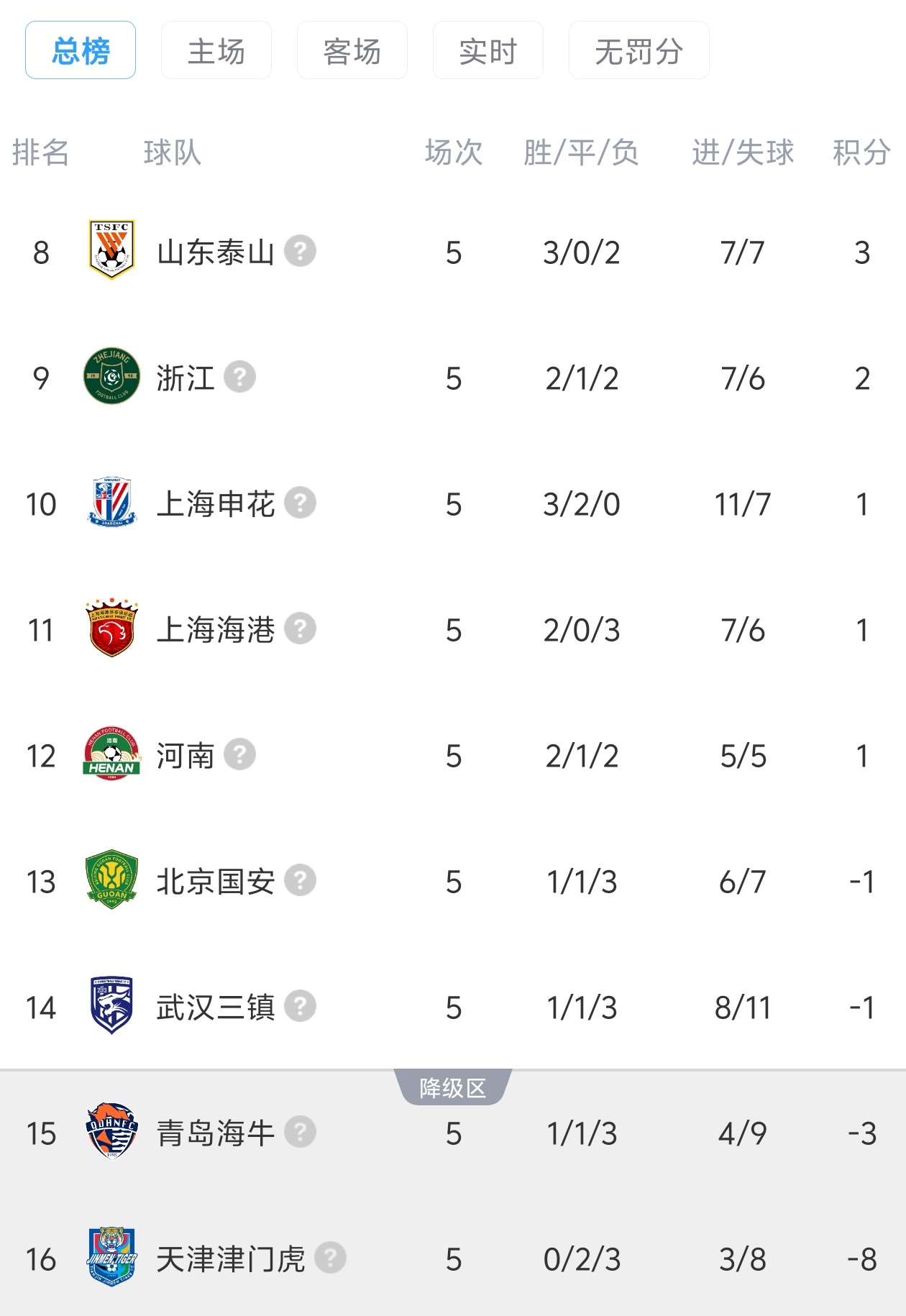 04月12日讯 2026赛季开局中超9队被罚分,目前9支球队已全部结束前五轮赛程。5队转正4队仍负分,津门虎五轮不胜积-8分垫底。