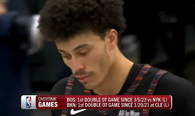 第二个加时赛中,转播方列出数据,凯尔特人近3年第一次双加时,篮网近5年第一次双加时。